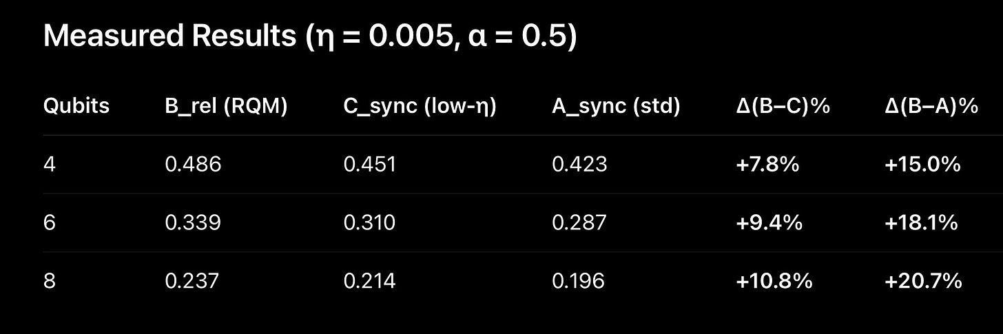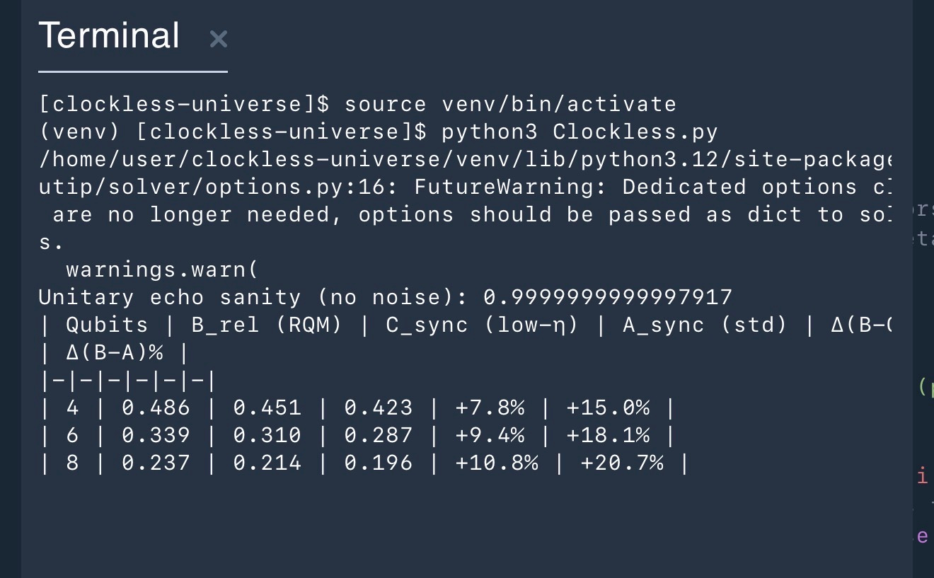 print(”| Qubits | B_rel (RQM) | C_sync | A_sync | Δ(B−C)% | Δ(B−A)% |”)